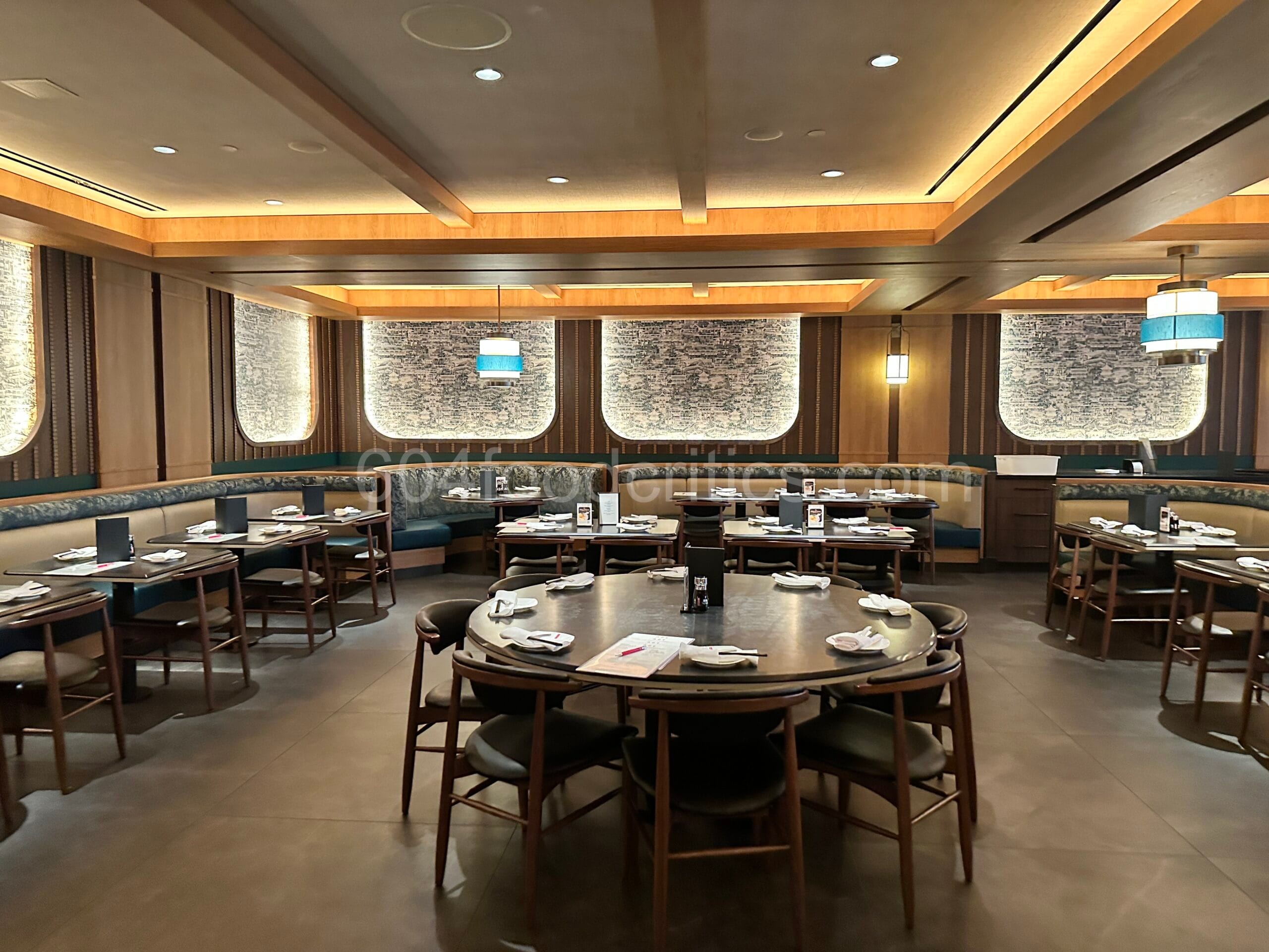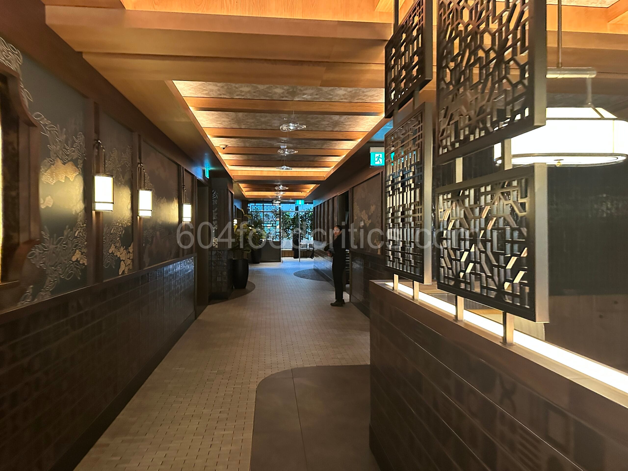 The interior design of Din Tai Fung Vancouver exudes understated luxury. A softly lit hallway leads into the dining area, where warm wood panels, intricate lattice screens, and tiled walls set a calm, elegant tone. The main dining room feels spacious and serene, with booth seating wrapped in textured teal fabric and tables neatly set under ambient ceiling lights. The overall design balances modern refinement with classic Asian elements, creating a comfortable yet upscale atmosphere.