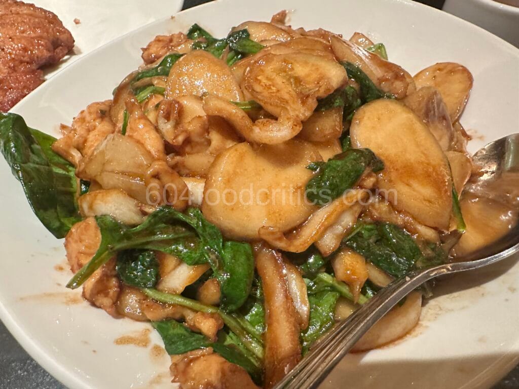 The stir-fried rice cakes with chicken and spinach bring a contrasting texture: chewy yet tender slices of rice cake tossed in a glossy soy-based sauce. The flavors are bold but balanced, ideal for sharing family-style.